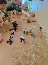 Był kolorowy piasek, muszelki, kryształki, suszone kwiatki, brokat i magiczny żel.